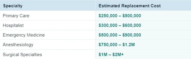 Replacing a physician costs between $250,000 and $2 million or more depending on specialty, when accounting for recruiting fees, signing bonuses, onboarding, ramp-up time, and lost patient revenue. Emergency medicine averages $500,000–$900,000. Surgical subspecialties often exceed $1 million.